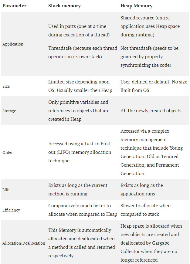总之,Java栈内存用于执行线程,并且它包含方法特定值和堆中其他对象的引用。让我们将栈和堆放入表格中,看看它们的区别。